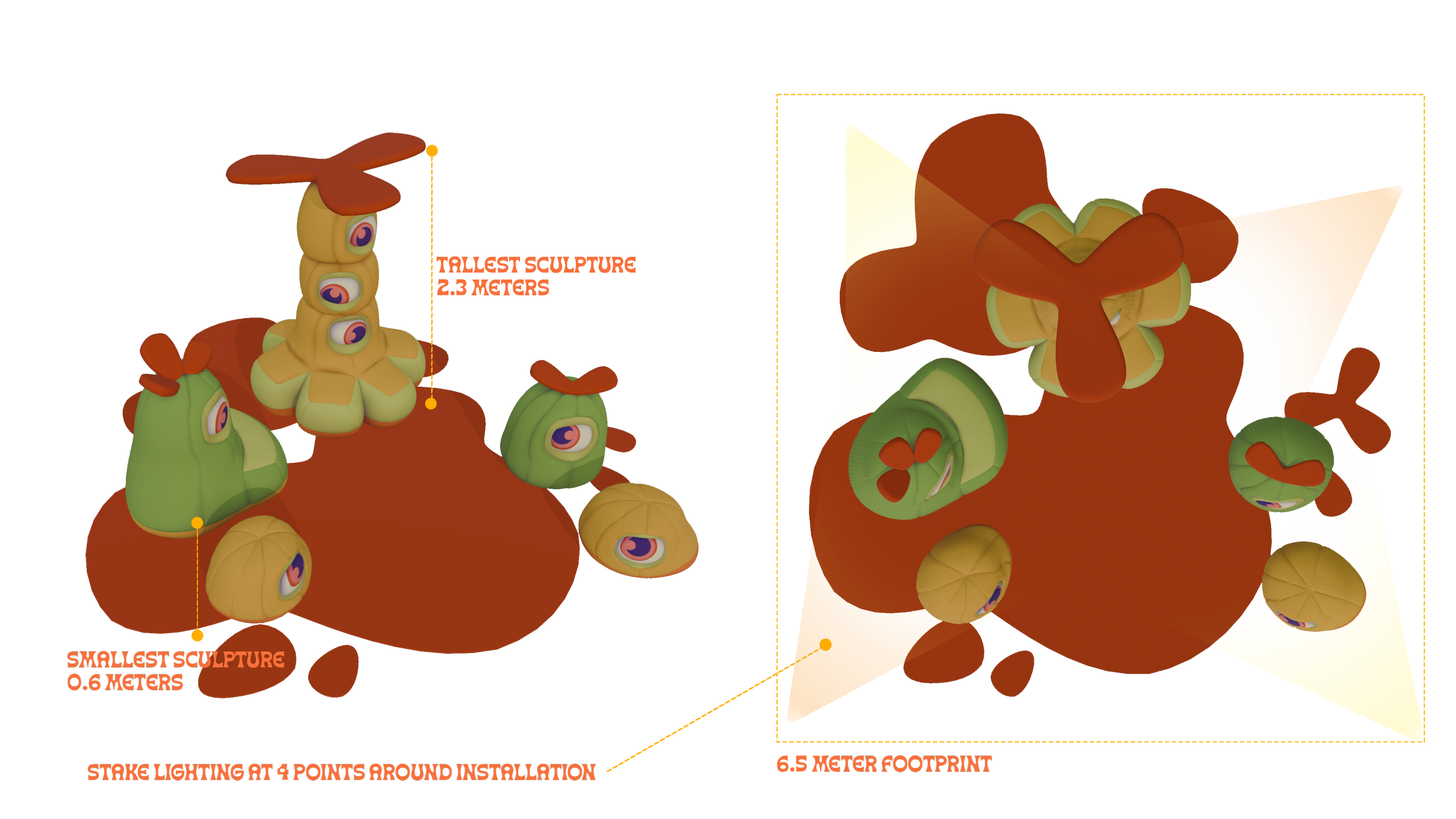 A cozy Sonoran Desert soft sculpture art piece meets lounge space. This layout has a 6.5 meter footprint, and is punctuated with weighted felt floor coverings & stake lights to create an inviting, homey feel.